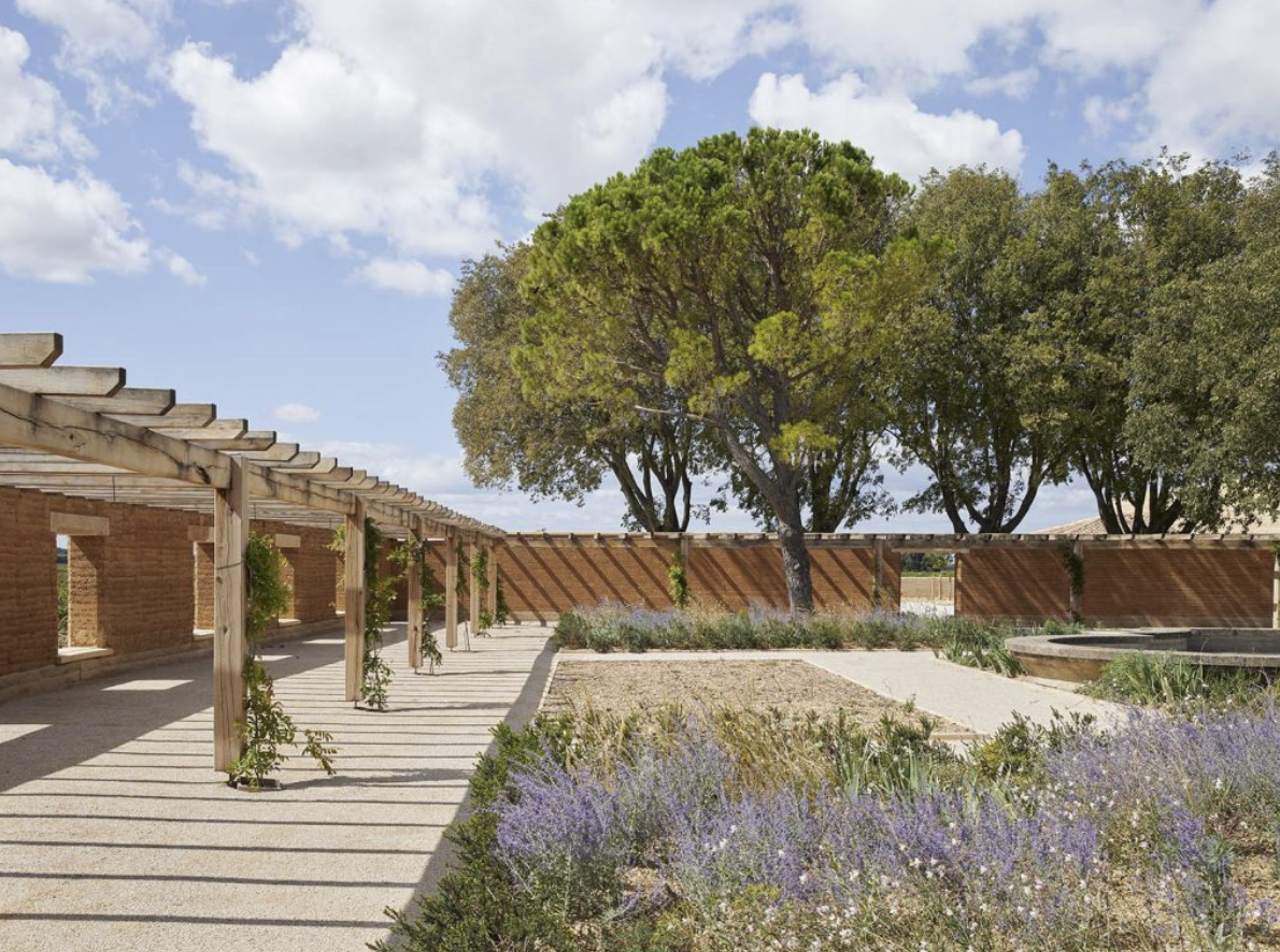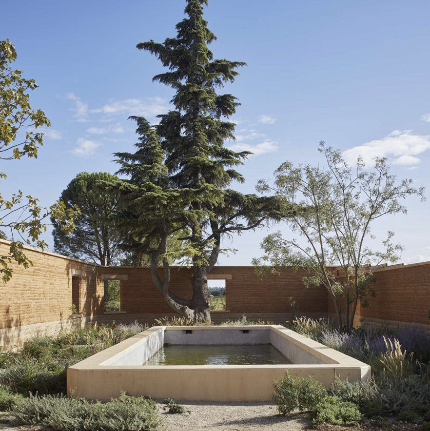 This quietly ecological approach extends to use of local timber and stone lintels from a nearby quarry. The demolished buildings were not only recycled in the site concrete; wooden beams were used to make furniture, windows and doors, and tiles were either reused elsewhere in the project or crushed for use in the landscaping. The gardens, designed by British landscape studio Tom Stuart‑Smith, consist of local plants capable of withstanding drought conditions.