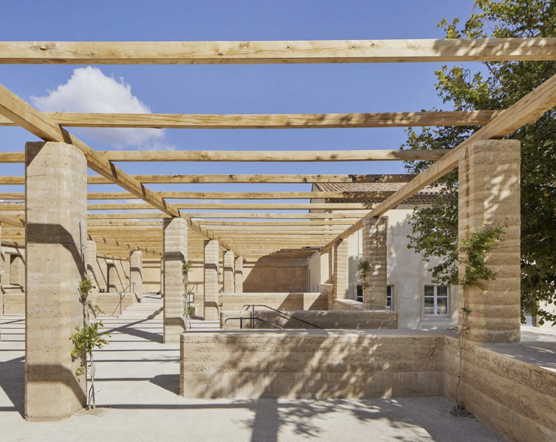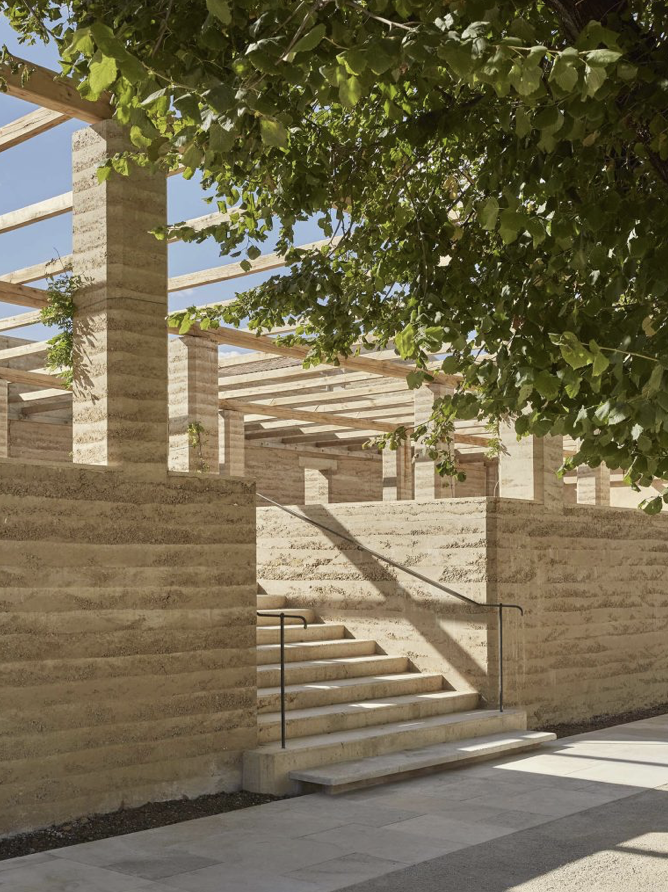 The family’s ambition was to futureproof and expand the winemaking facility as well as better welcome the public. From the small car park in the south‑western corner of the site, visitors pass through a walled garden, the pisé walls punctured with openings that frame views of the vineyards beyond. They are invited to wander in the shade of timber pergolas or around the garden laid out around a pre‑existing pool, before gathering in the restored and reconfigured manor house. Internally, the walls have been plastered with a mix of hemp, lime and earth from the site, but chunks of the original stone structure remain visible, and a new exposed timber‑trussed roof replaces the old.