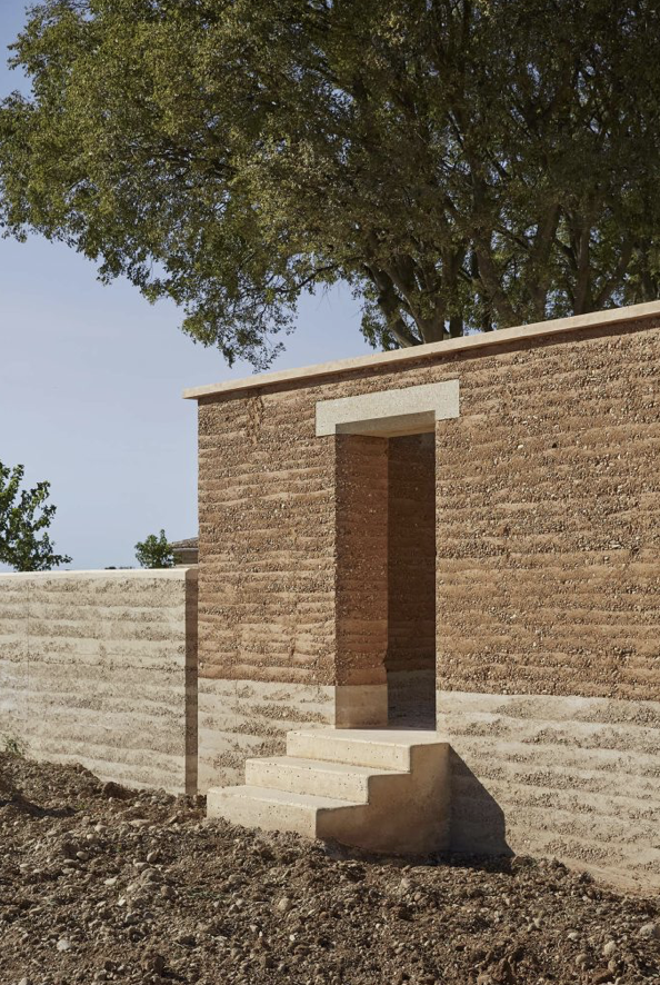 During their initial investigations on‑site, the architects of the winery’s new extension, Studio Méditerranée and Studio Mumbai, hoped to find enough clay and gravelly sand in the ground to construct around half of the project out of rammed earth (known as pisé in French) and the other half out of what they call béton de site, or ‘site concrete’. The project is described by head of Studio Mumbai Bijoy Jain as a balanced ‘displacement’; the material excavated to make room for large underground cellars and water reservoirs has been used to create the buildings above ground. When this excavation did not produce enough clay and gravelly sand for the original plan, instead containing large amounts of silt, the design was adjusted so that around a quarter of the project was constructed out of rammed earth and the rest of rammed concrete. The concrete mix was also modified – some of the demolished concrete structures were crushed and added to complete the formula.