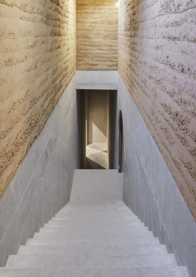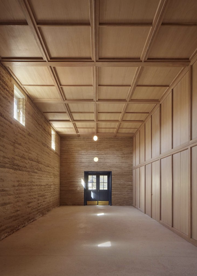 As a result, only a small amount of the 24,000m3 of material excavated from the ground had to be discarded. Rammed earth, without lime or cement, was suitable for the single‑storey walls of the guesthouse in the south‑eastern corner of the site as well as walls that enclose the gardens. Site concrete made with lime – manufactured at 900°C rather than cement’s 1,200°C and which absorbs CO2 as it hardens – was used in most of the rammed concrete walls; in the underground cellars, however, the structural loads required so much lime in the concrete mix that cement, sourced locally, proved to be the less carbon intensive option. The large reservoir tanks, on the other hand, are constructed from entirely new concrete, rather than any site‑sourced aggregates, as they had to be waterproof.