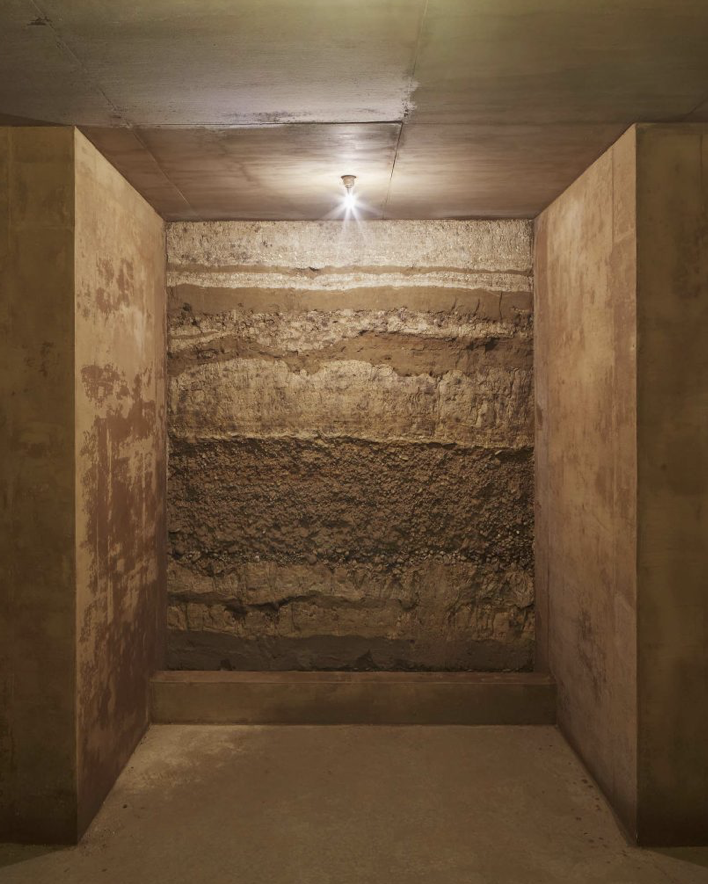 The walls made with site material have the colour and texture of the ground around them – a rich russet in the pisé, a dustier biscuit in the site concrete. There is resonance with the winemaking notion of terroir, referring to the specificity of a vineyard’s environment – its geology, topography, climate, even its biosphere – and the impact on a wine’s character. The importance of terroir to Château de Beaucastel’s winemaking process, in particular the site’s geology, is showcased in an underground chamber, where a slice of concrete wall is removed to reveal the strata of clay, sand, silt and limestone, like delicately stacked layers of chocolate patisserie. Many winemakers argue that terroir concerns human interventions as much as natural conditions – pruning, training, which varieties are grown where. This building is similarly inflected, indiscriminately expressive of both pre‑human ground and human‑made layers. After all, concrete is the geology of the anthropocene.